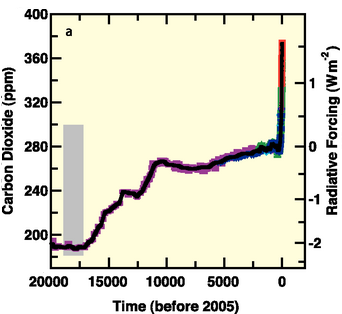 У прошлости концентрација гасова са ефеком стаклене баште у атмосфери је била мање-више у равнотежи због природног циклуса кружења угљеника између земљишта, океана и биосфере. Циклус кружења угљеника је одржаваао равнотежу између емисије гасова услед природних процеса (вулканске ерупције, труљење органске материје) и апсорпције гасова (океани, биосфера, земљиште, седиментација у земљишту и окенима). Међутим, са почетком индустријске револуције и порастом потрошње фосилних горива (угаљ, нафта и гас) [iii] долази до поремећаја ове равнотеже и пораста концентрације гасова са ефектом стаклене баште за преко 40%, тј. са 275-285 [iv] делова на милион (ppm, particles per million [v]) на 400 ppm колико је износила у пролеће 2013. године [vi]. Емисија је повећана (природна плус антропогена), а апсорпција је остала на истом нивоу и чак се у последње време због засићености океана смањује.