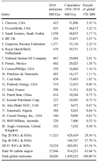 Укупна емисија у периоду од 1750. до 2010. године је била 1450 милијарди тона СО2. Ових 90 компанија је емитовало 914 милијарди тона СО2 у овом периоду. При томе компаније у врху листе бележе профите од којих се човеку заврти у глави. Шеврон 26 млрд. долара, Ексон 45 милијарди, Шел 27 млрд. долара (подаци за фискалну 2012. годину)