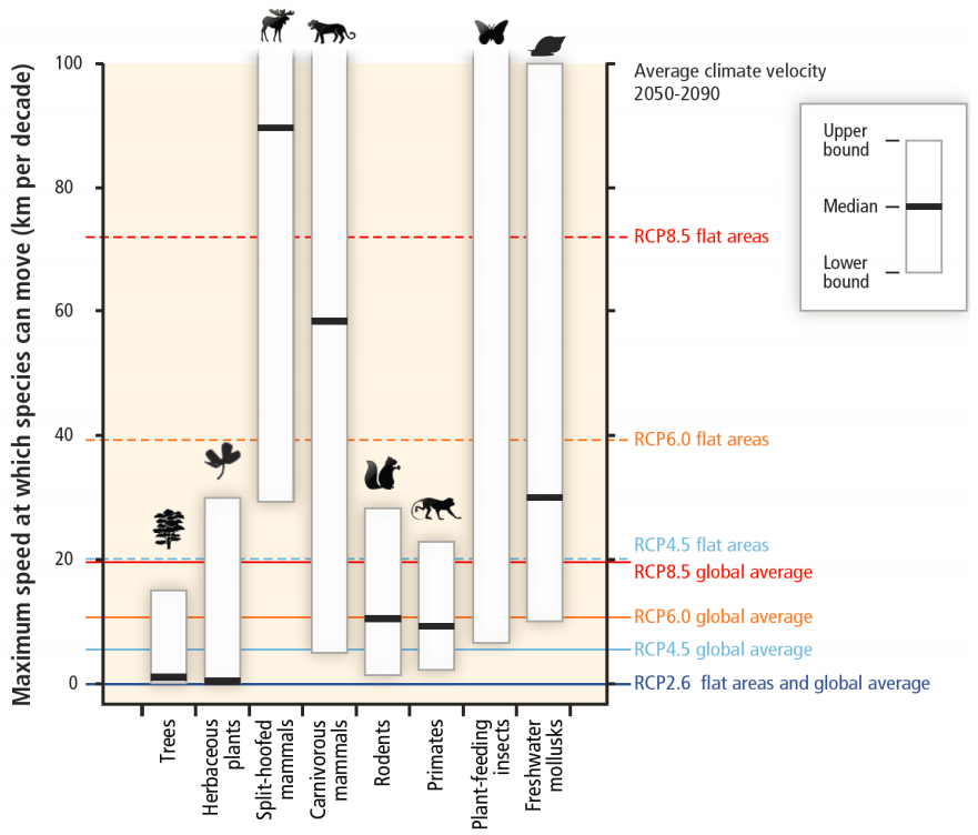 Брзина миграције одређених врста у односу на прогнозиране промене климе. Извор: IPCC (кликните за увећање)