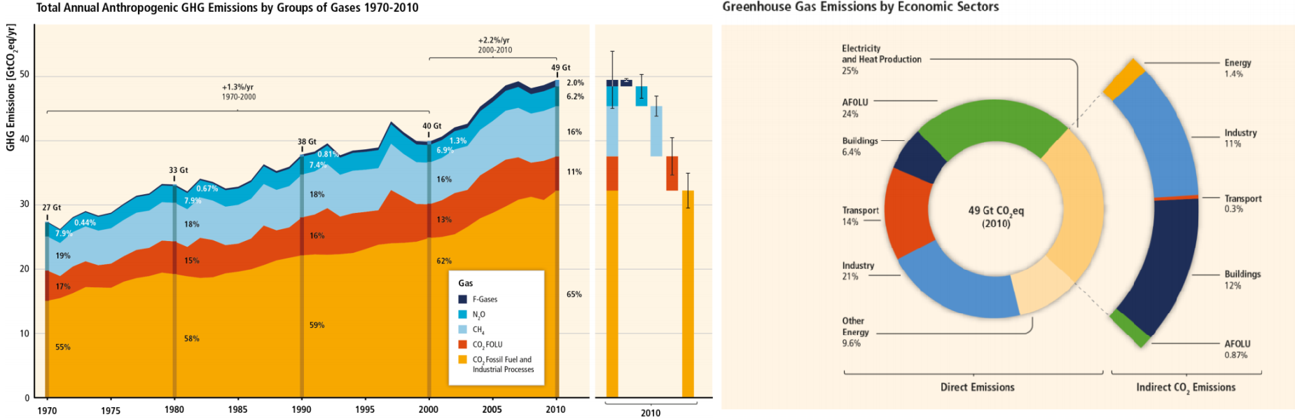 - Највећа емисија GHG у историји човечанства је забележена 2010. год.** и износила је око 49 GtСО2eq. Од тога 35% отпада на сектор енергетике, а 24% на пољопривреду, шумарство и промена намене земљишта (AFOLU, Agriculture, Forestry and Other Land Use).