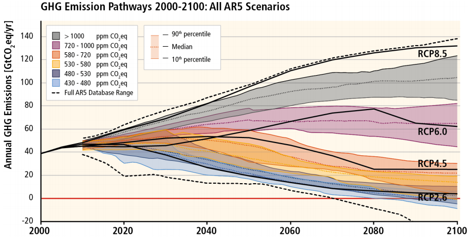- За потребе израде извештаја, радна група III је обрадила око 900 сценарија кретања емисије GHG до 2100. године. Да би се пораст температуре услед људски узрокованих промена климе заджао испод 2°С (глобално договорен „безбедан“ ниво загревања изнад температуре пре индустријске револуције) концентрација GHG не би смела да пређе 450 ppm (particles per million, делова на милион) СО2eq у 2100. години – сценарио RCP2.6***. Тренутна концентрација GHG у атмосфери је око 400 ppm СО2eq****. Ако наставимо да емитујемо као до сада (BAU, business as usual) концентрација GHG у атмосфери ће прећи 1000 ppm СО2eq – сценарио RCP8.5.