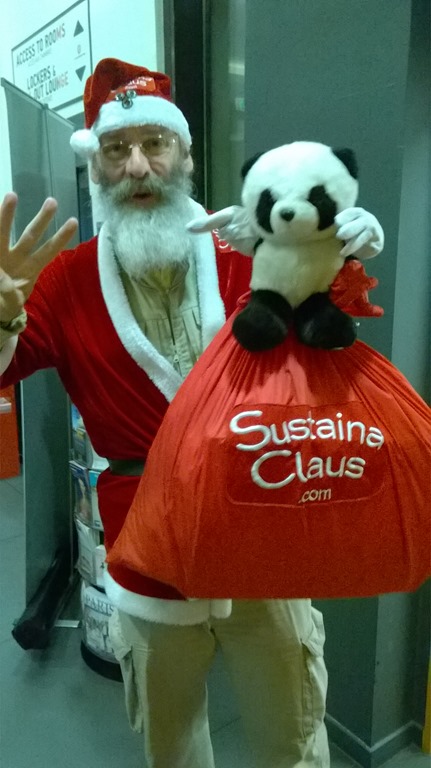 Održivi Deda Mraz (Sustaina Santa) će verovatno biti jedan od hitova ovogodišnjeg COP21. Nabasao sam na njega u mom hotelu. Pitate se šta nosi u vreći. Osmehe. Prema rečima ovog Deda Mraza ljudi su veoma napeti, a kada ste napeti ne možete da rešite problem. Da bi rešili problem prvo vam treba osmeh i Održivi Deda Mraz ih besplatno deli.