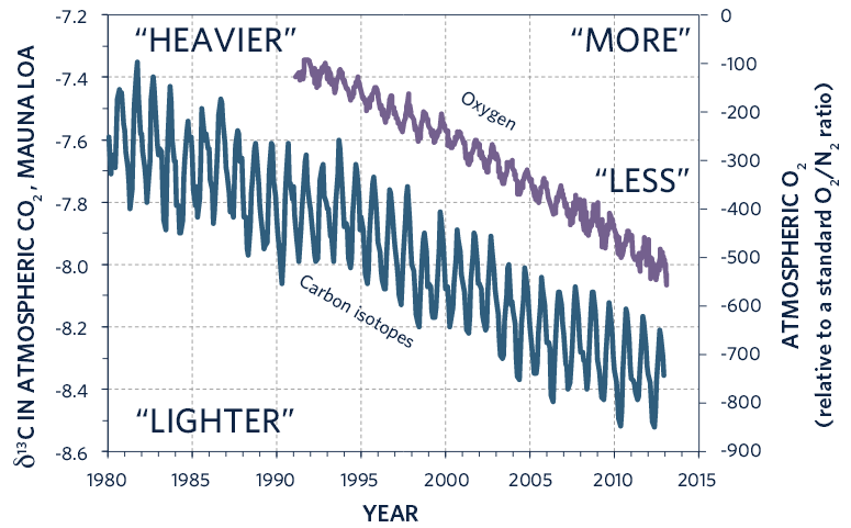 Па, зашто је ово важно? Зато што је антропогена емисија углавном резултат спаљивања биљака – крчење шума и наравно употреба фосилних горива. Фосилна форива су настала од некадашњих биљака и она имају однос изотопа С13/С12 који се класификује као „лак“.
